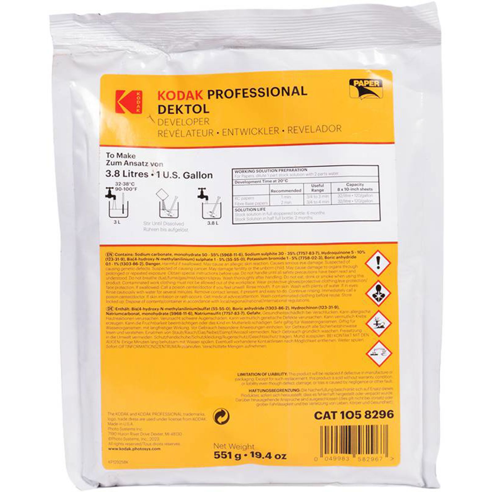Kodak Professional Dektol Paper Developer Powder To Make 3.8L